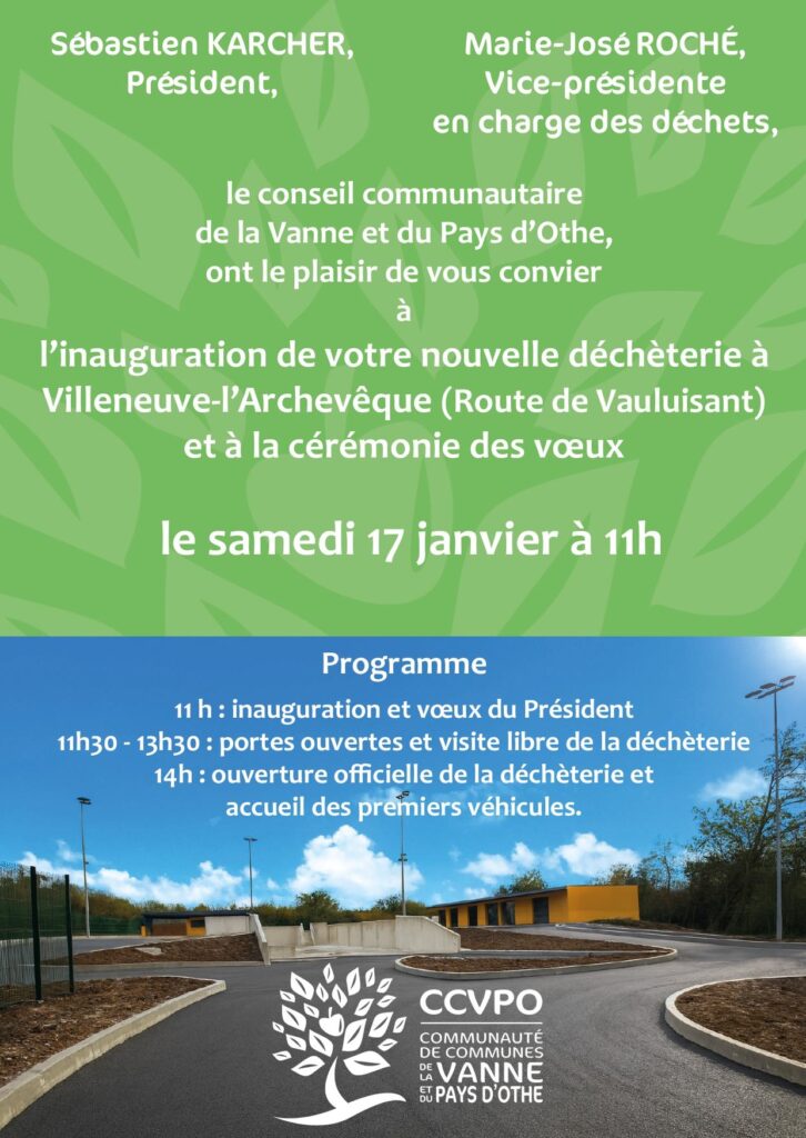 Veuillez trouver ci-dessous l’invitation pour l’inauguration de la nouvelle déchèterie de Villeneuve-l’Archevêque, qui se tiendra le Samedi 17 janvier à 11h00.